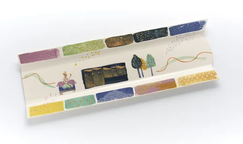 Slip-cast Earthenware with back-painted vitreous slips and enamel decoration, 80 x 25 x 6 cm.
